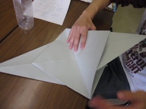【速報】初の巨大折り紙 2010年11月20日 に きよし が投稿 — コメントはありません ↓ 本日3回目,きよしです. 現在,初のVisitorさんが巨大折り紙に挑戦しています. その様子を手元の写真で紹介! 二人の上にあるペットボトルは折り目をしっかりつけるときに使います. さあ,何が出来上がるのかなー?