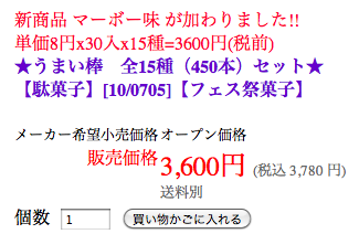 450本で3600円ってことは,倍の900本で7200円.これに送料+手数料で8565円.